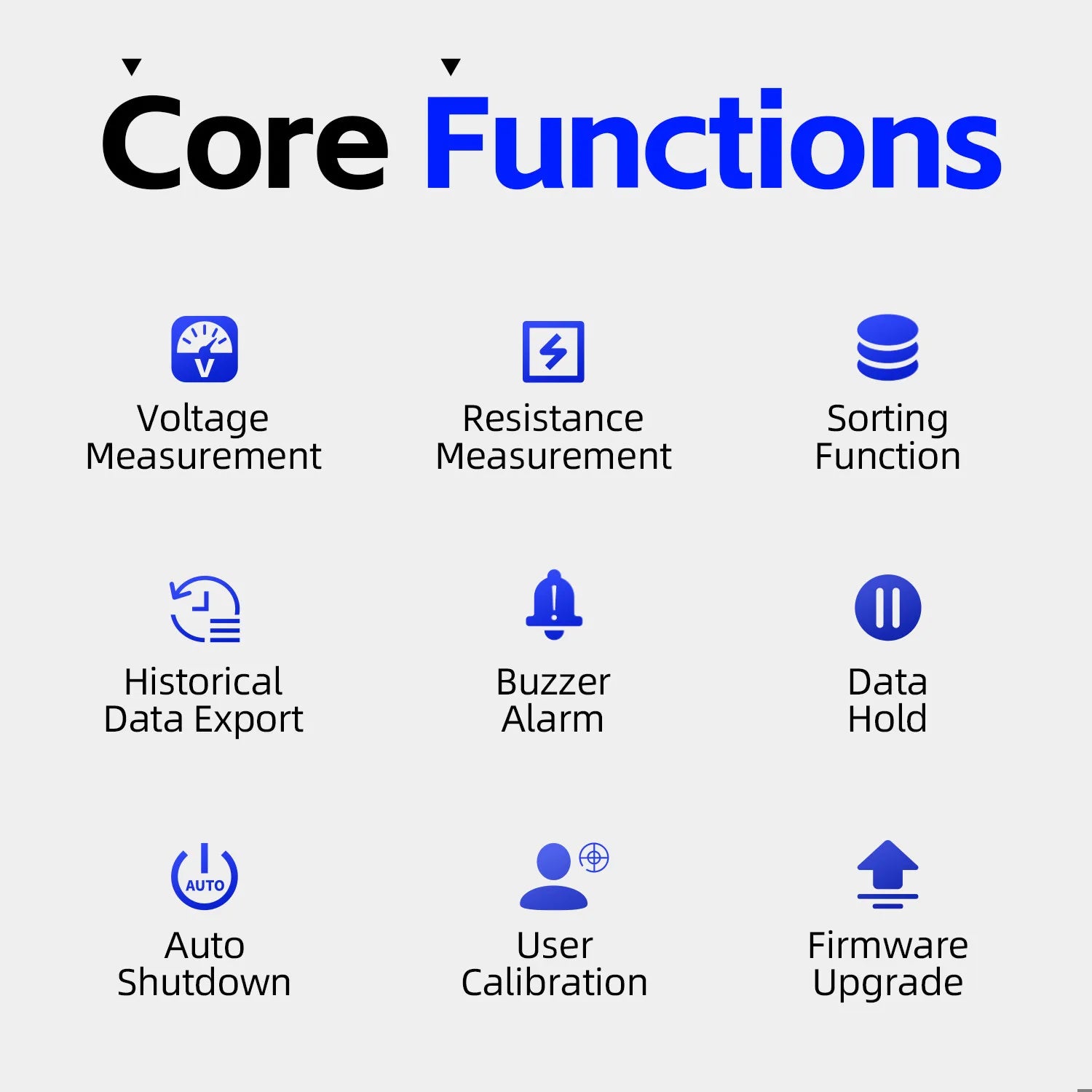 Das Produkt verfügt über einen Sortiermodus, der automatisch gute und schlechte Batterien anhand benutzerdefinierter Schwellenwerte filtert. Zudem werden Messhistorien unterstützt, die exportiert und als Datentabellen gespeichert werden können.