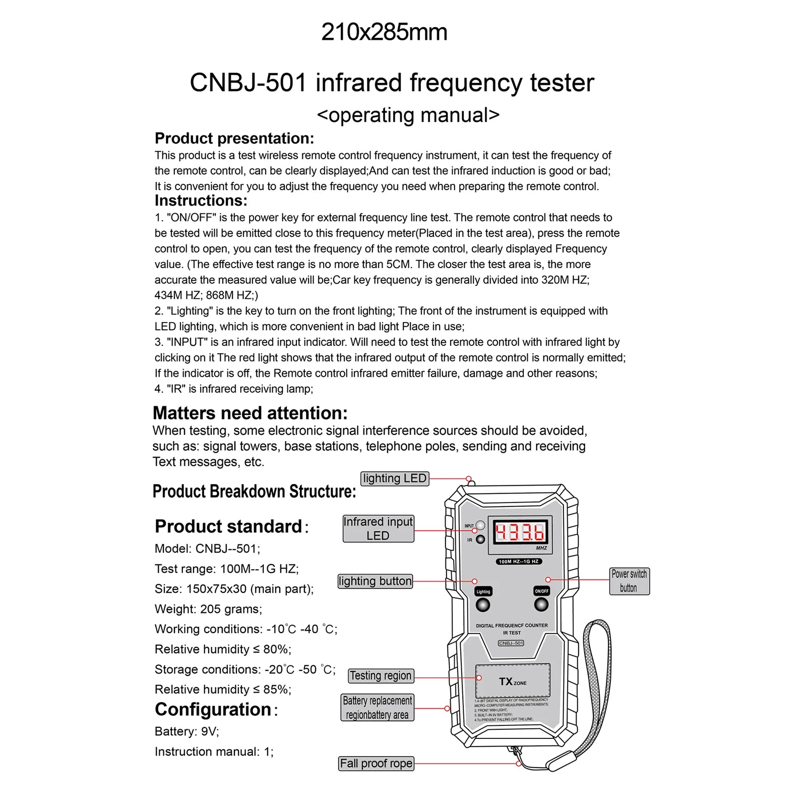 Bei diesem Produkt handelt es sich um ein Test-Frequenzinstrument für drahtlose Fernbedienungen. Es kann die Frequenz der Fernbedienung testen und deutlich angezeigt werden.